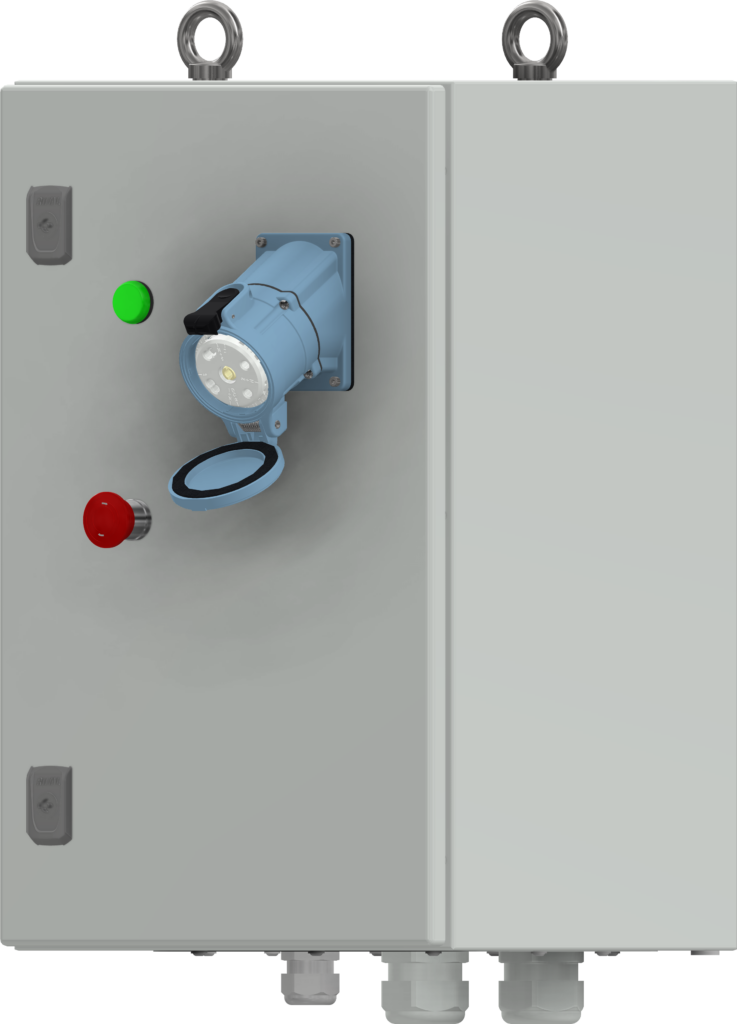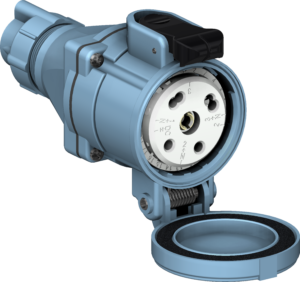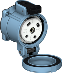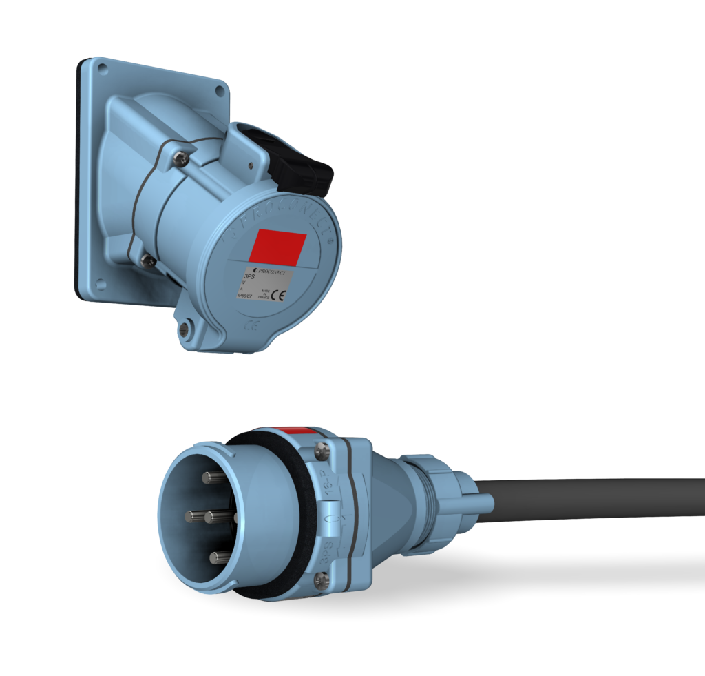Male receiving part to be placed wall-mounted or on an electrical cabinet. The plug cap option is needed to ensure IP66 when not connected.