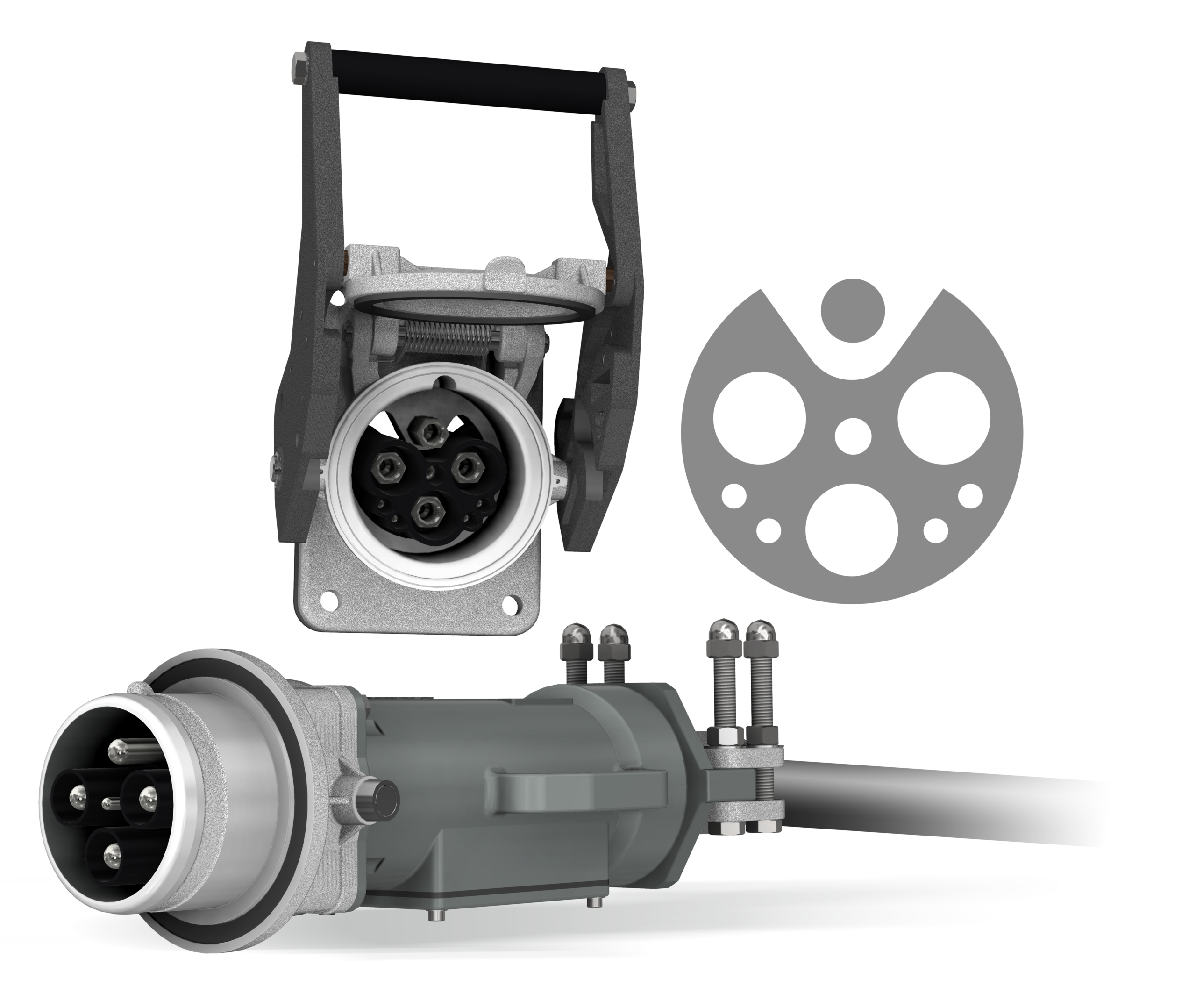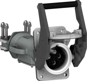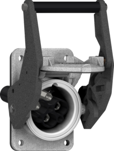 Active part to be placed wall-mounted or on an electrical cabinet. Cam push/pull system to maintain IP67 when closed or help and lock the connection of a plug.