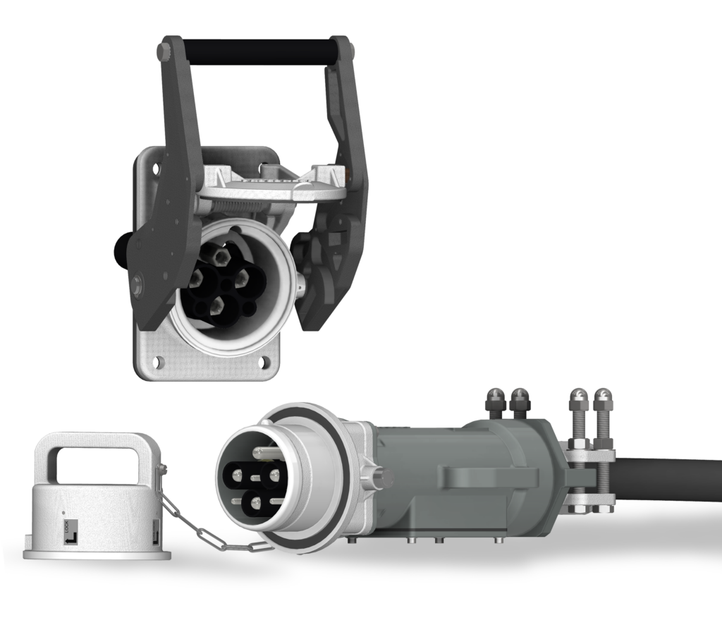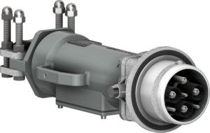 Mobile connector to be cabled and connected in a socket or a cable coupler. The plug cap options are needed to ensure IP67 once disconnected.