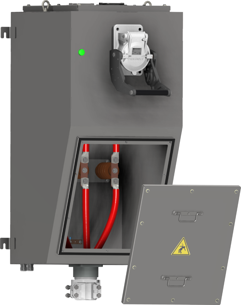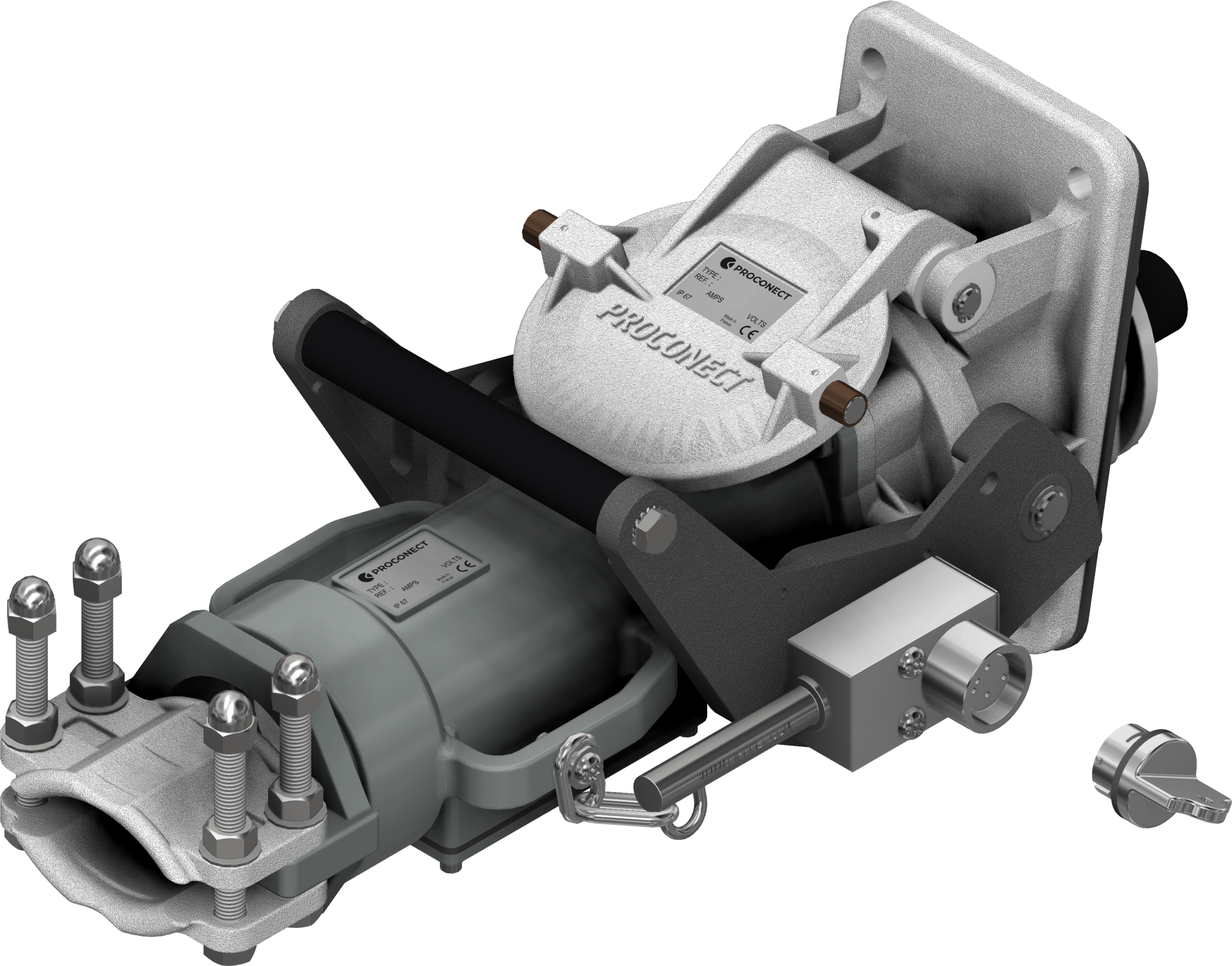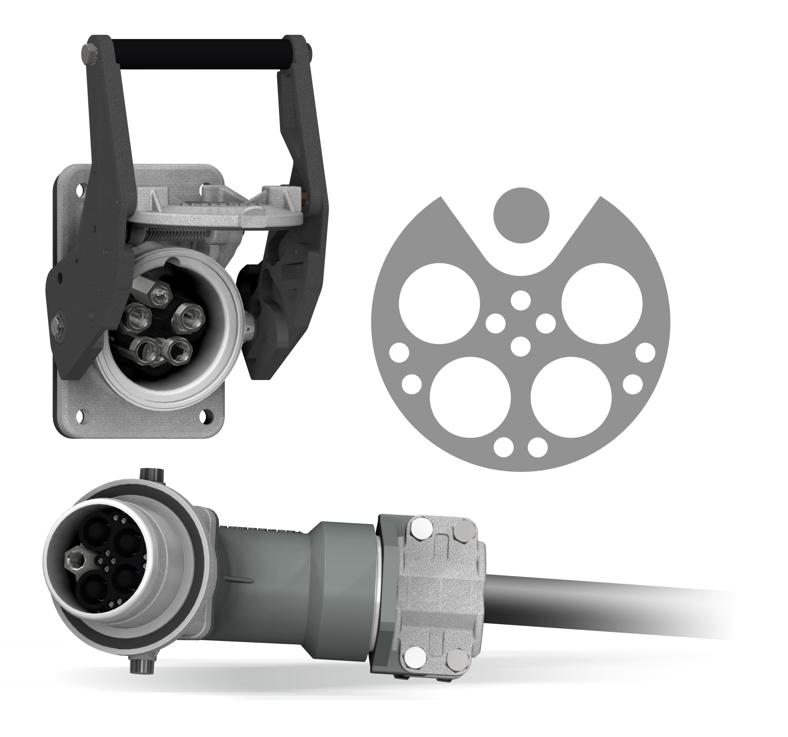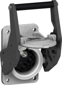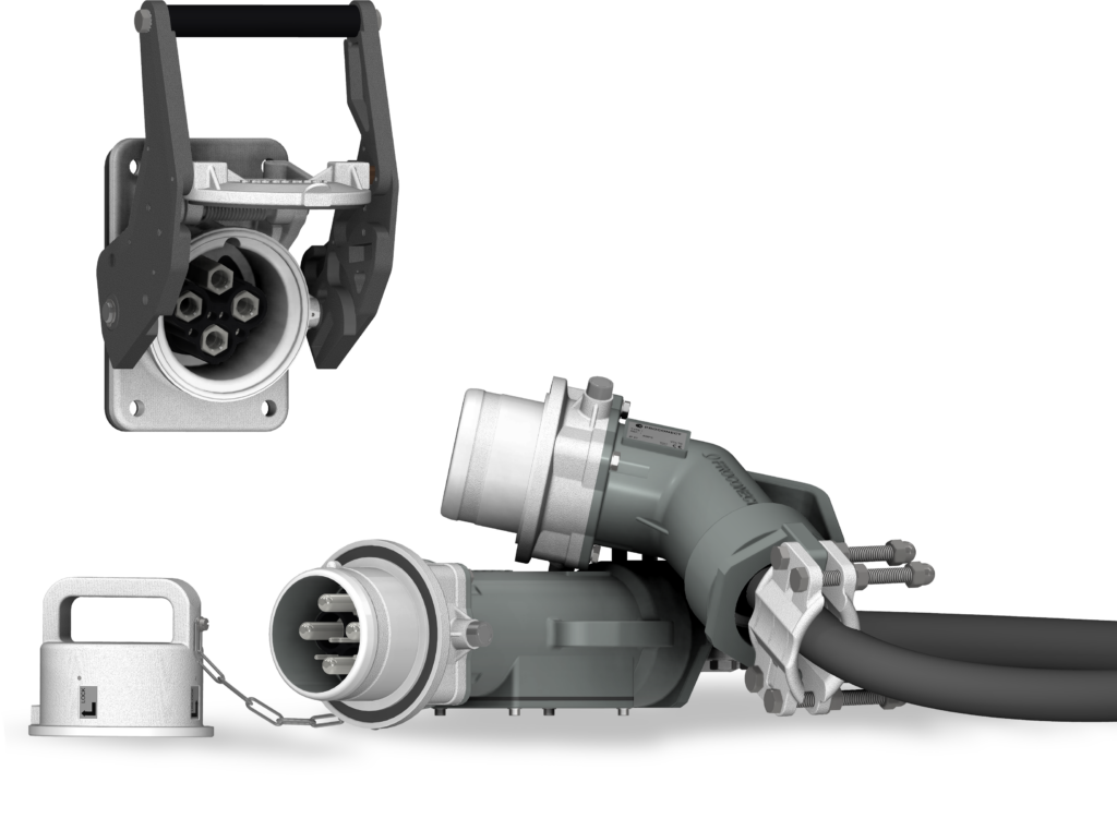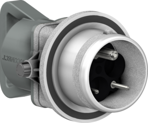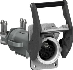 Active part to be placed wall-mounted or on an electrical cabinet. Cam push/pull system to maintain IP67 when closed or help and lock the connection of a plug.