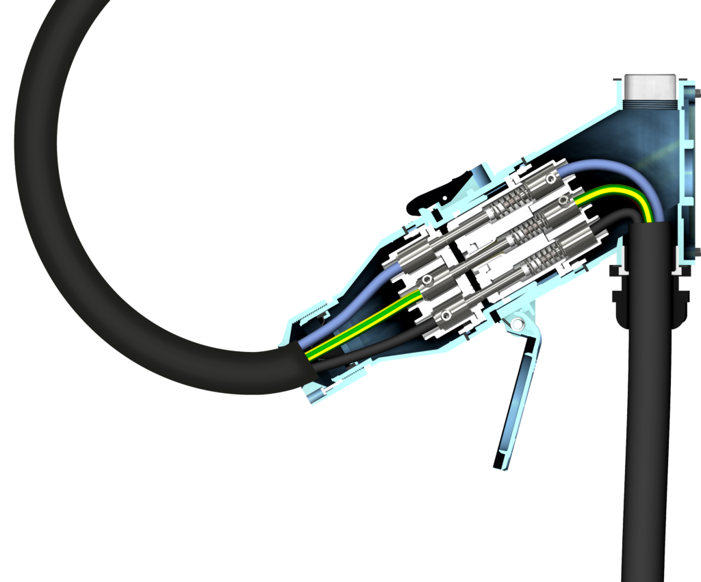Mobile female part to be cabled and connected in appliance inlets or plugs connectors. No access to under voltage parts with its safety shutter.