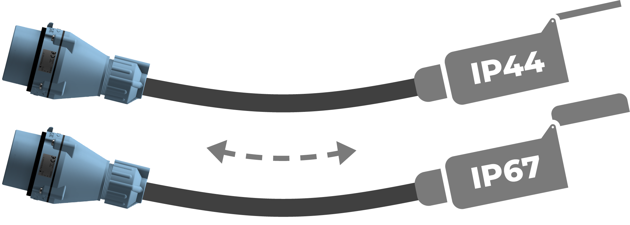 Adaptors on request, adjustable cable length for optimal integration, IP44 or IP67 solutions. Can be used to connect boat already equiped with CEE connections.