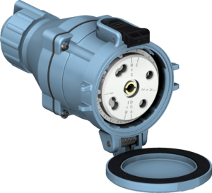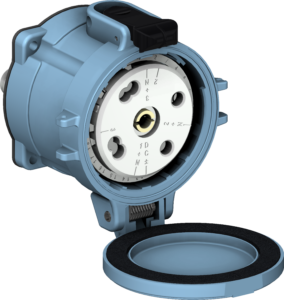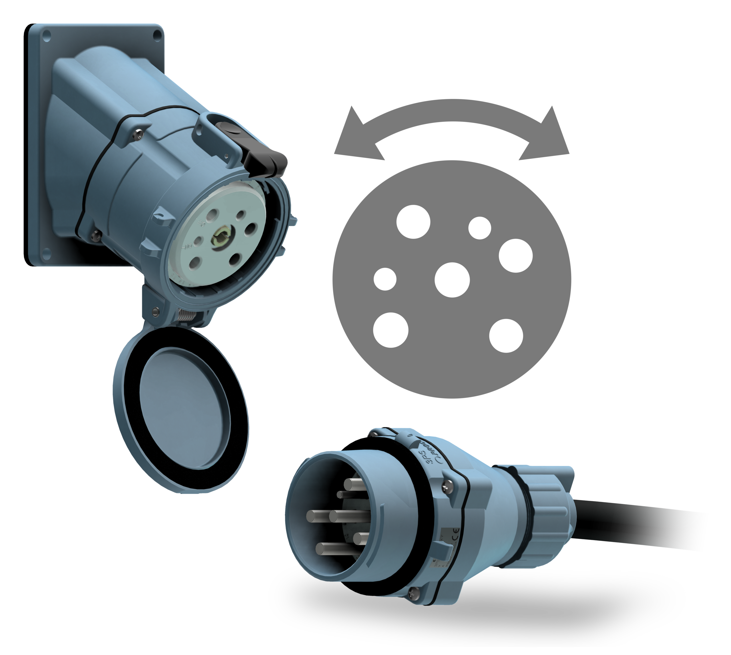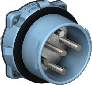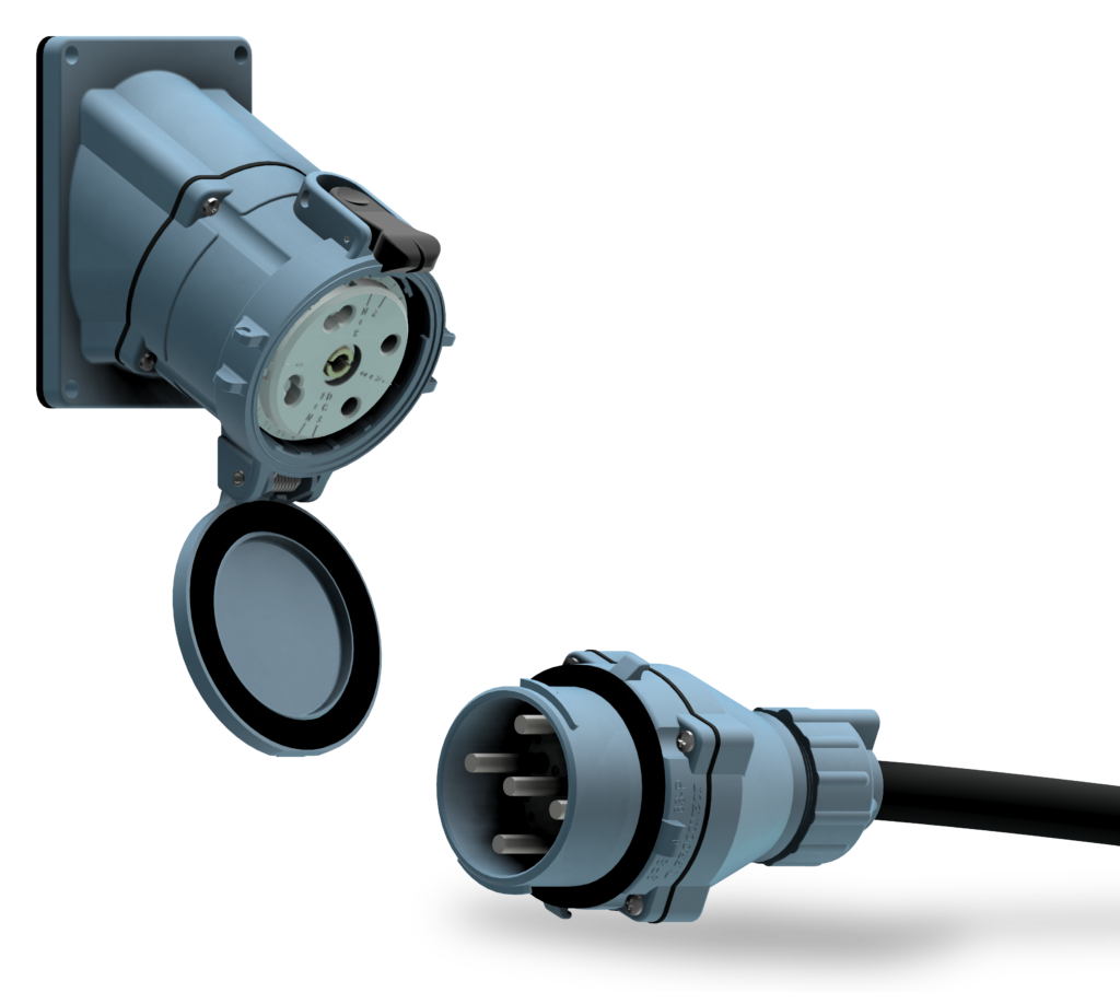 Male receiving part to be placed wall-mounted or on an electrical cabinet. The plug cap option is needed to ensure IP66 when not connected.
